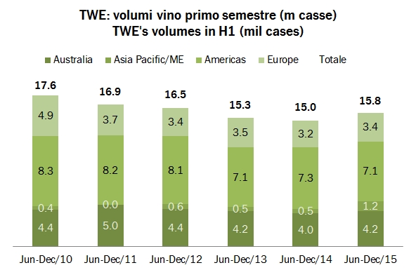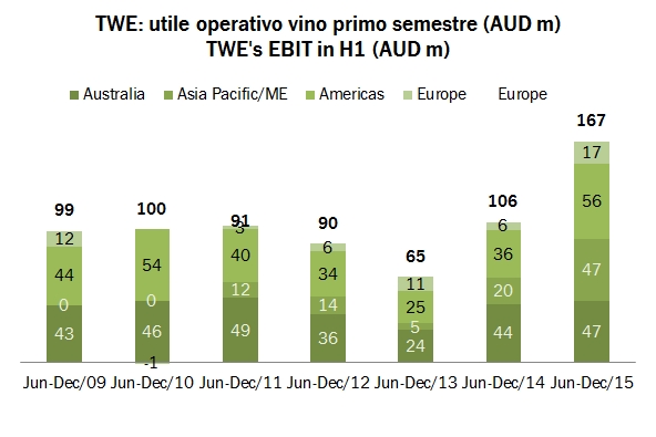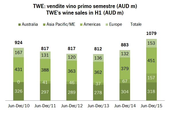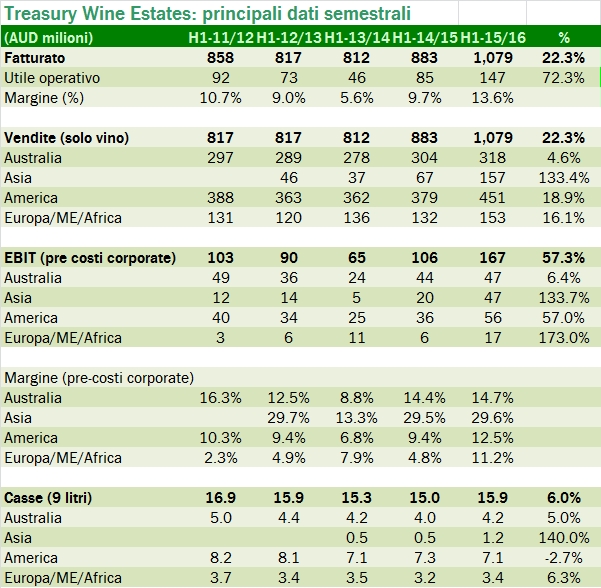 I risultati del primo semestre 2015-16 mostrano il ritorno di TWE alla crescita sia delle vendite che dei margini. Come abbiamo già commentato nei post precedenti, l’azienda viene da un lungo percorso di rilancio, cominciato con la svalutazione degli eccessi di scorte, la ridefinizione delle priorità del portafoglio, fino appunto al rilancio commerciale. Certamente non è stato solo questo: la svalutazione del dollaro australiano è continuata nel semestre, -11% in media per l’azienda, aiutandola a sfondare nel mercato asiatico e a migliorare i margini in tutte le aree di attività. Non solo, come sapete TWE ha annunciato l’acquisizione di Diageo Wines per 600 milioni di dollari americani, che viene consolidata da gennaio (quindi non compresa in questi numeri che vanno da luglio a dicembre 2015) e che non determina un significativo cambio della struttura finanziaria, che non mostrava debito a fine anno. Tornando ai numeri del semestre, le vendite di 1.08 miliardi di dollari locali crescono del 22% e l’utile operativo prima dei costi generali raggiung 146 milioni di dollari, +72%. In entrambi i casi la metà di questa crescita viene dai cambi, l’altra metà dal processo di rilancio. Andiamo a leggere qualche numero insieme.