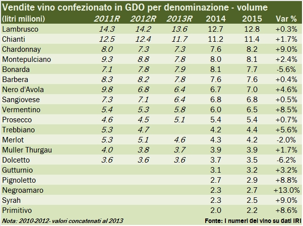 Vinitaly ha pubblicato le anticipazioni sulle vendite di vino in GDO 2015, che sono cresciute dell’1.4% nel 2015, a un valore (che è il totale del campione che viene aggiornato di anno in anno) di 1.54 miliardi di euro. Il dato è positivo, come dice il comunicato, anche se si appoggia su un 2014 piuttosto negativo (-0.7% a causa del forte calo dei volumi). All’interno dei numeri ci sono delle tendenze piuttosto importanti: 1) quella, ben conosciuta, dei vini Bio, che perè sono ancora meno di 10 milioni di euro rispetto a un totale di oltre 1.5 miliardi; 2) una seconda, secondo me molto importante, che è lo spostamento del mercato verso i vini bianchi. Non stiamo parlando solo di spumanti, che peraltro vanno bene (+8%), ma anche dei bianchi fermi. Il Vermentino ha “distaccato” il Prosecco con una crescita del 10%; 3) la crescita di due formati, su cui si sta polarizzando gradualmente il mercato: le bottiglie e il bag-in-box (peraltro su un livello molto contenuto di vendite). Andiamo ad analizzare i dati insieme.