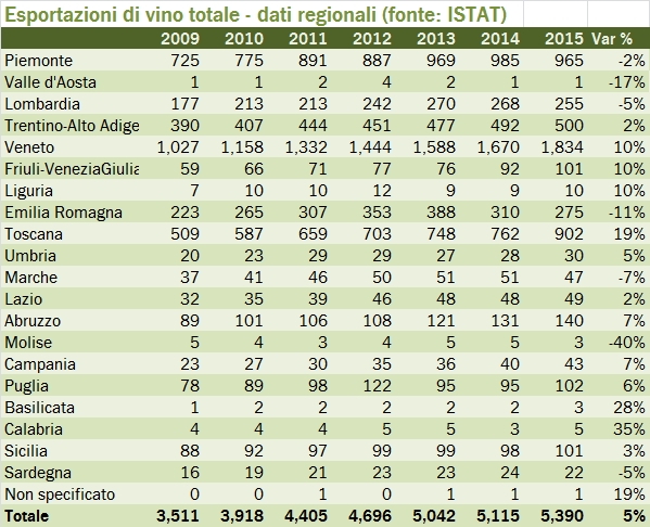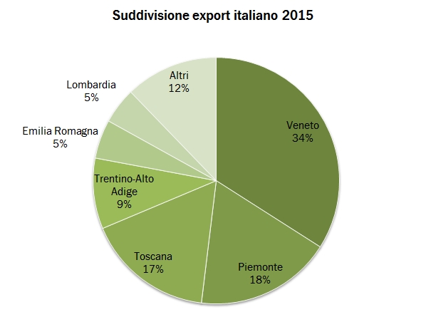 - Fatto un export totale di 5.4 miliardi di euro, esattamente un terzo, 1.8 miliardi vengono spediti dai veneti, quasi il doppio dei 965 milioni dei piemontesi e 900 milioni dei toscani. Le tre regioni principali insieme fanno il 70% delle esportazioni totali di vino italiano. Se mettiamo insieme il Trentino Alto Adige, Emilia Romagna e Lombardia arriviamo a ridosso del 90% del totale.