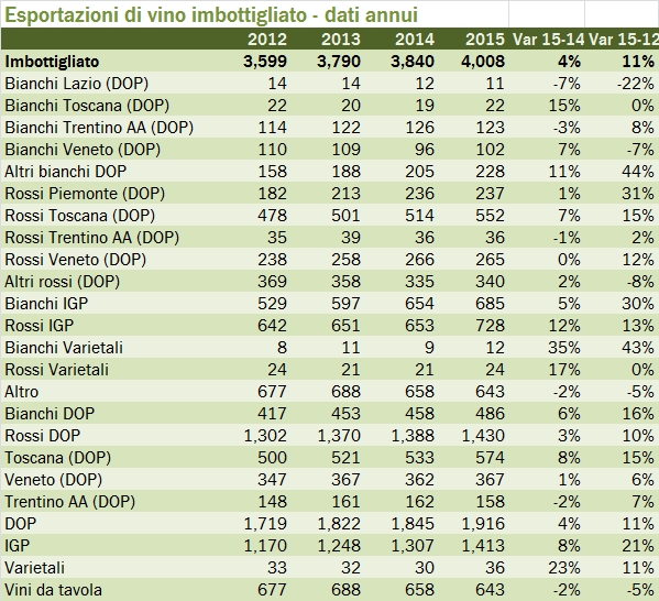 Chi cerca trova. Incuriosito da dei dati sulle esportazioni che non sono mai riuscito a estrarre ho scoperto che ISTAT pubblica una statistica trimestrale sulle esportazioni di vino italiano per regione, tratta dalle categorie ATECO (non esattemente le medesime che usiamo). Quindi oggi aggiorno e arricchisco il classico post sul dettaglio dell’export per zona e per tipologia con questa nuova tabella. Come sapete le esportazioni sono cresciute del 5% nel 2015. Il maggior traino è venuto dalle due delle tre regioni chiave per il vino italiano all’estero, il Veneto, che ha mantenuto la velocità di crociera del +10% degli ultimi anni, soprattutto grazie ai vini spumanti, e la Toscana, che ha prodotto un balzo del 19%, ben al di sopra dell’andamento degli anni precedenti. Dal punto di vista delle tipologie di prodotto, i vini IGT sono stati i protagonisti della crescita nel segmento dei vini imbottigliati nel 2015, soprattutto nella categoria dei vini rossi. Con l’avvertenza che i dati regionali sono riferiti a tutte le categorie di vino, mentre i dati per colore e tipologia solo ai vini imbottigliati, andiamo ad analizzare insieme qualche numero.