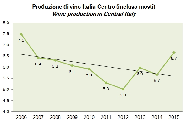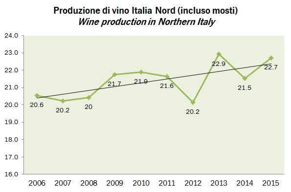 - La produzione totale di 48.24 milioni di ettolitri è il 15% sopra il dato di 42.1 milioni del 2014 e del dato medio degli ultimi 5 anni, 43.88 milioni di ettolitri.