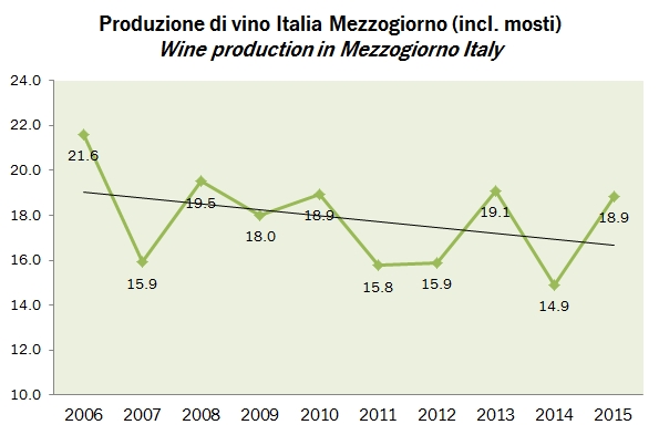 - Anche al sud le cose sono andate bene, 18.85 milioni di ettolitri, 4 milioni in più del 2014 e il 13% sopra la media storica. Il “numerone” è quello della Puglia, che balza a 7.5 milioni di ettolitri, 2.1 milioni in più del 2014, cioè +40% e +28% sulla media storica. Guardando invece ai dati della Campania (+32%) o della Sicilia (+23%), entrambi in linea con le medie storiche, l’interpretazione del balzo produttivo del 2015 è più di un recupero dei valori del passato dopo una pessima produzione.