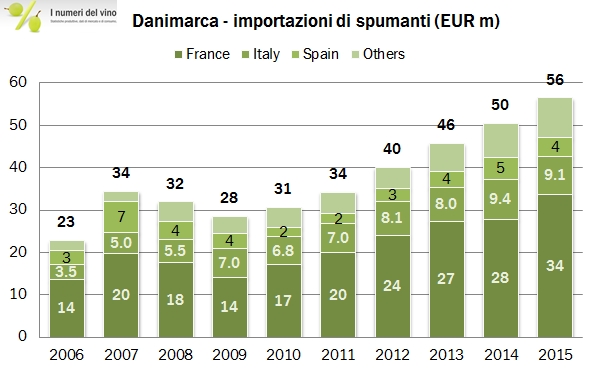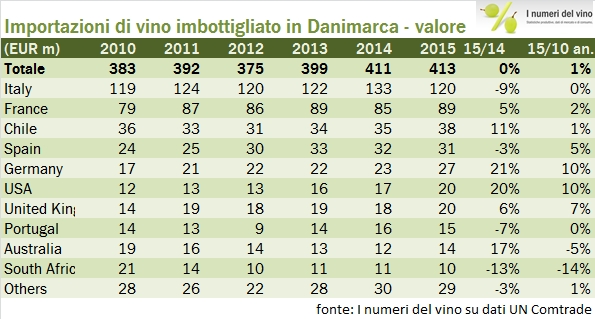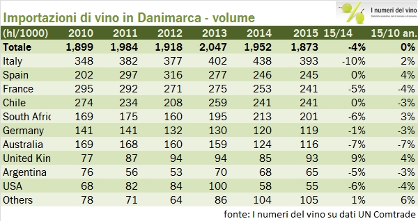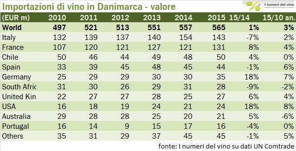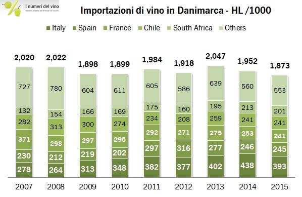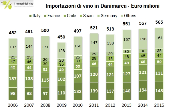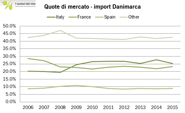 Il mercato danese del vino, che ben si esprime con le importazioni data la mancanza di produzione locale, è rimasto stabile nel 2015. Le importazioni di 565 milioni di euro sono state dell’1% superiori al 2014 e sono cresciute al ritmo del 3% negli ultimi 5 anni, mentre si sta manifestando un calo dei volumi importati. Nel 2015 il volume acquistato dai danesi è sceso del 4% a 1.87 milioni di ettolitri, dopo un calo corrispondente del 2014. I cambi non hanno avuto un impatto importante: la corona danese è rimasta stabile negli ultimi 10 anni rispetto all’euro. I leader di mercato sono chiaramente Italia e Francia; non solo questo però, analizzando approfonditamente i dati si nota come negli ultimi anni il mercato danese sia tornato sui vini europei rispetto a quelli del nuovo mondo.