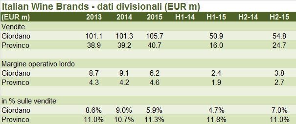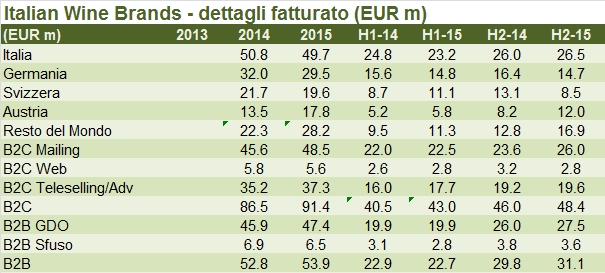 - Le vendite 2015 sono cresciute del 3% a 145 milioni di euro. La suddivisione del fatturato che trovate in tabella spiega come si è giunti a questo risultato: la spinta è venuta dalle vendite B2C, cioè Giordano, che ha avuto un buon andamento dalle vendite “postali” e “televisive”, +6%, mentre calano in maniera piuttosto stupefacente le vendite internet, -3% sull’anno e -13% sul secondo semestre. Il segmento B2B invece registra un incremento del 2%, a causa del calo delle vendite di vino sfuso.