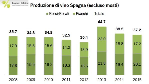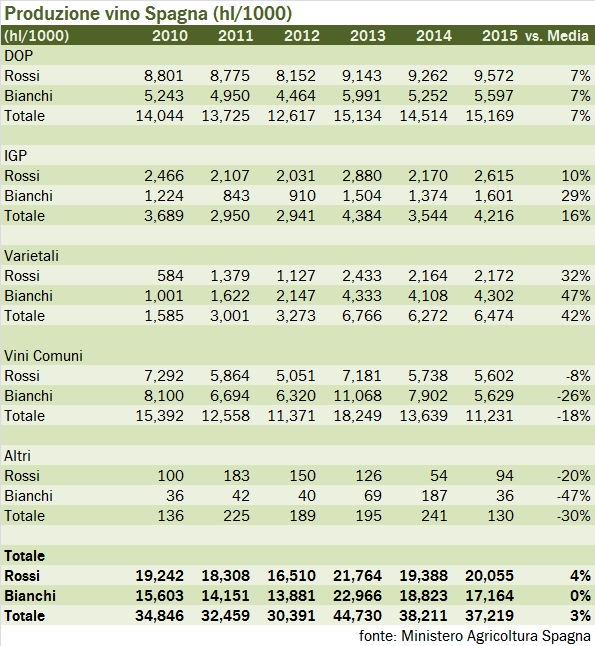 La produzione di vino in Spagna nel 2015 ha subito un leggero calo, riportandosi più in linea con le medie storiche degli ultimi anni. I dati  che analizziamo oggi, 37 milioni di ettolitri di vino e 5 di mosti, mostrano un recupero in valore assoluto dei volumi di vini di qualità, DOC IGT e varietali, a spese della produzione di vini da tavola, che toccano il loro minimo storico all’11% della produzione totale di vino. Se questa qualità in crescita sarà riconosciuta dal mercato è prevedibile un buon anno per le esportazioni spagnole, con un recupero del prezzo medio di vendita che attualmente, essendo ben sotto 1.50 euro al litro, è il più basso tra i paesi che esportano vino. Andiamo dunque a leggere insieme i dati del Ministero dell’Agricoltura iberico.