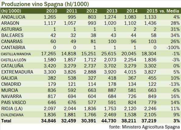 • Passando alla parte che più ci interessa, la produzione vinicola scende del 3% a 37.2 milioni di ettolitri. Siamo ancora 1 milione di ettolitri sopra lo standard spagnolo degli ultimi anni, ma dopo la vendemmia boom del 2013 (quasi 45 milioni di ettolitri) ci stiamo riportando nell’alveo delle vendemmie normali. Anzi, probabilmente visto che il 2015 è stato un grande anno per la produzione di vino in Italia ma anche in Francia, probabilmente il dato spagnolo è anche un po’ deludente.