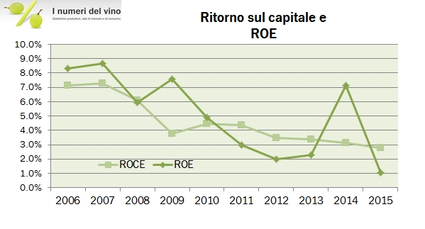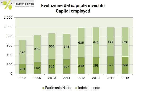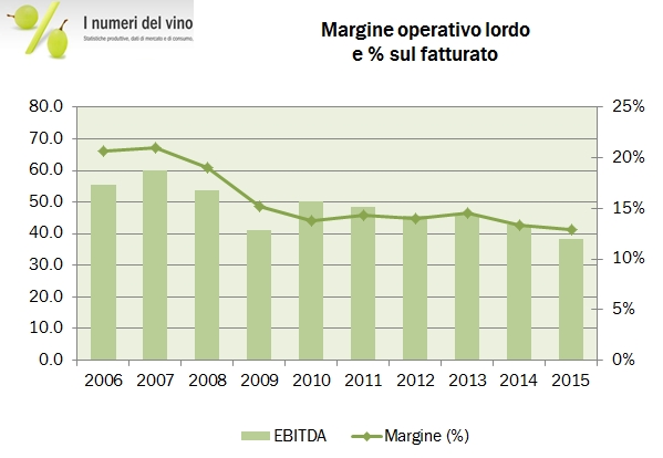• I margini sono sotto pressione, soprattutto nella parte importante dell’attività, lo Champagne. Il MOL scende dal 13.3% al 12.9% del fatturato, quindi da 43 a 38 milioni di euro, mentre l’utile operativo è giù dell’11% a 28 miliioni di euro. Di questo, 22 milioni sono relativi allo Champagne e al Porto e mostrano un calo del margine dal 10.3% dello scorso anno all’8.5% del 2015.