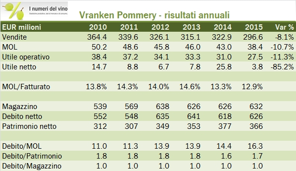 Per capire bene i conti di Vranken Pommery il riferimento a cosa è successo allo Champagne nel 2015 è importante. Abbiamo pubblicato questo rapporto qualche giorno fa: il mercato francese è andato molto male, soprattutto nella parte finale dell’anno, quando ricorderete ci furono i terribili attentati a Parigi. Quindi, a fronte di un mercato che a valore ha raggiundo 4.8 miliardi di euro, +5%, sono le esportazioni a determinare praticamente tutta la crescita (+12%). Tornando a Vranken Pommery quindi possiamo ben immaginarci un anno difficile. Oltre al problema Champagne-Francia, VP ha anche provveduto a “deconsolidare” parte dell’attività dei vin de sable, che ha determinato un impatto negativo del 6% sul fatturato. Mettendo dentro tutto, il 2015 è da dimenticare: le vendite calano dell’8%, l’utile operativo dell’11%, il debito sale nella stessa misura del magazzino. Tutto questo richiede un cambio di strategia, che è stato appena annunciato: focalizzazione sui margini di profitto e riduzione del livello delle scorte, che sono particolarmente rilevanti (oltre 2 anni di vendite) per ridurre il livello del debito che ha ormai raggiunto la soglia record di 16 volte il margine operativo lordo. Passiamo ai numeri.
