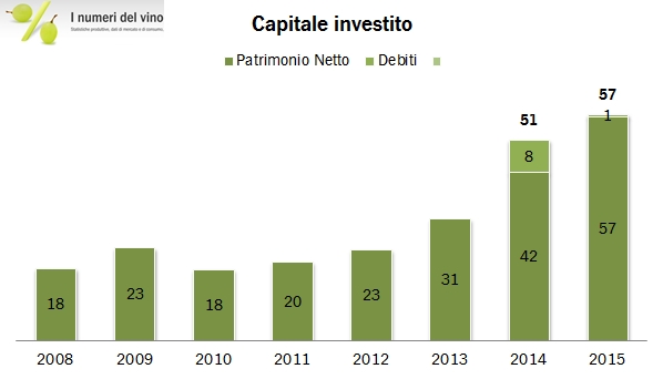 - Dal punto di vista finanziario, Botter è sempre stata un’azienda con poco debito. Nel 2015, la posizione finanziaria netta è praticamente neutrale, in miglioramento da circa 8 milioni di debiti nel 2014. Nel 2015, l’attività ha generato un flusso di cassa di 15 milioni di euro, che dopo investimenti di 7 milioni di euro (di cui 3.3 per immobilizzazioni finanziarie relativa a una società agricola acquistata tramite la fusione con una controllata nel 2015).