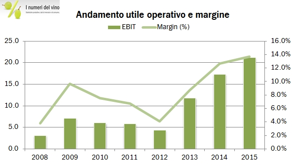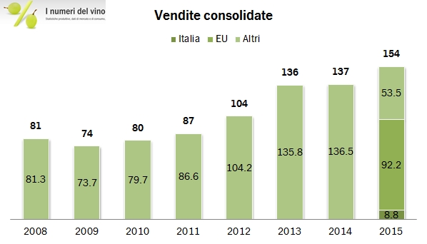 - Le vendite sono cresciute del 13% a 154 milioni di euro, con un incremento del 14% per il vino (139 milioni) e del 3% dei succhi d’uva (15 milioni). Le vendite in Italia sono una parte molto marginale dell’attività, soltanto 9 milioni di euro. Il grosso dell’attività è in Europa, con 93 milioni di euro nel solo segmento vino (+15%, compreso il presumibile calo in Russia), 34 milioni di euro in Nord America (+21%, anche grazie alla forte svalutazione dell’euro) e 11 milioni nel resto del mondo (in leggero calo).