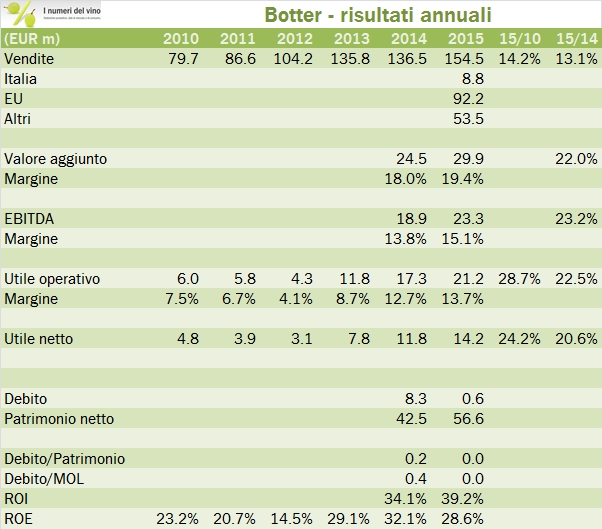 Dopo diversi anni di assenza (ultimo bilancio analizzato qui: 2008) ritorniamo ad analizzare Botter, che sta diventando uno degli operatori chiave del settore del vino italiano. Ci sono diversi elementi “straordinari” in questa azienda. Per prima cosa, il ritmo di crescita impressionante, con un fatturato quintuplicato negli ultimi 20 anni, il che corrisponde a crescere del 10% in media all’anno. Secondo, la trasformazione degli 3-4 anni, quando l’azienda ha cominciato a strutturarsi, muovendosi da una attività di commercio di vini sfusi (e succhi di uva) per spingere sempre di più i prodotti imbottigliati, integrandosi a monte nella produzione di una piccola parte dei prodotti e allargando la gamma a vini più pregiati. Tutto questo ha portato Botter a essere l’ottavo player italiano nel settore del vino per vendite (compresi i succhi d’uva), il terzo per esportazioni (con una quota di mercato salita in pochi anni dall’1.7% al 2.6%) e, a differenza di quanto si poteva dire qualche anno fa, tra i primi cinque per generazione di utili. Chiaramente un operatore da seguire, anche grazie alla disponibilità di Simonpietro Felice e Massimo Tonini. A fine 2015, Botter ha venduto la divisione succhi d’uva che ha fatturato 6.5 milioni di euro. Il 2016 anno è dunque partito con un leggero handicap di vendite, ma a questo punto l’azienda è totalmente concentrata sul vino. Focalizziamoci sul 2015.