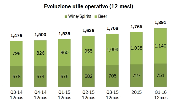 - I margini continuano a crescere, sia a livello consolidato che prendendo soltanto la divisione vino. Tutta CB ora genera un margine vicino al 30% a livello consolidato e intorno al 23% per la divisione wine&spirits. Questo riguarda naturalmente il primo trimestre, che è stagionalmente basso per il vino ma più propizio per la birra. Se guardiamo agli ultimi 12 mesi, il vino è intorno al 25% in termini di utile operativo su fatturato, con un contributo di circa 750 milioni di dollari rispetto a un valore totale di 1891.