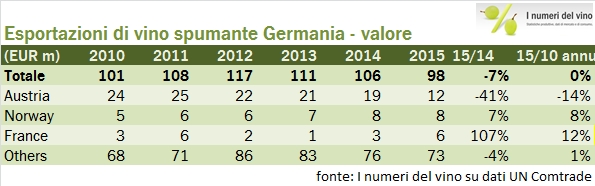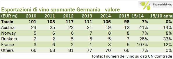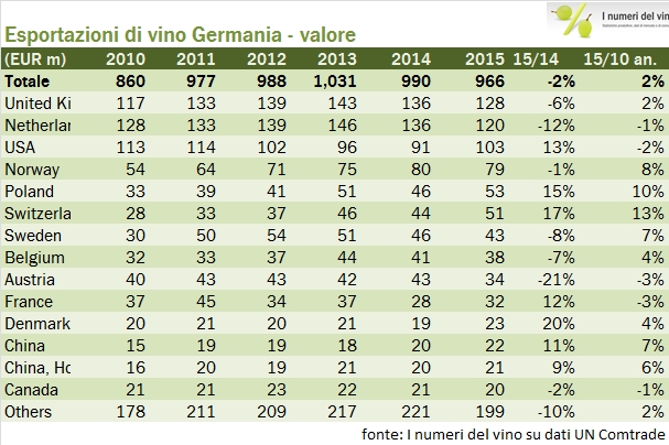 - Le esportazioni tedesche di vino sono state nel 2015 966 milioni di euro, in calo del 2% rispetto al 2014, a sua volta il 4% sotto il picco storico di 1031 milioni del 2013. Dei 966 milioni di euro, 98 sono fatti da vino spumante e 94 da vino sfuso, lasciando dunque al prodotto imbottigliato la parte predominante.
