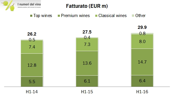 - Dal punto di vista delle categorie di prodotto, se il 2015 era stato l’anno degli Amaroni (“top wines” nella categorizzazione di Masi), nel 2016 tornano a crescere i premium wines (la categoria più importante e anche profittevole per l’azienda, essendo per la maggior parte IGT che vengono vendute con una forte connotazione al marchio Masi), +8% a 15 milioni di euro, e i DOC classici, +10% a 8 milioni di euro.
