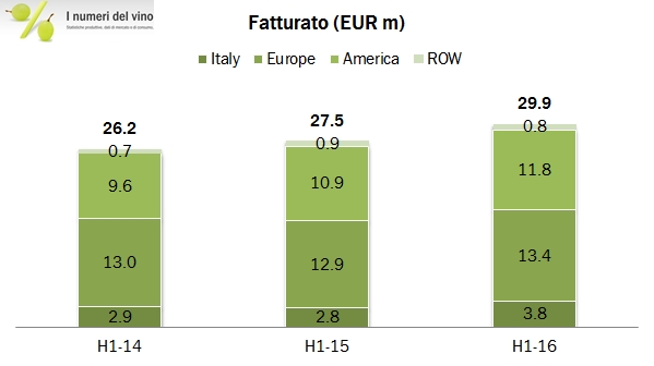 - Il fatturato sfiora 30 milioni di euro, +9%. Un forte contributo alla crescita viene dall’Italia, +35% a 4 milioni di euro, anche grazie all’apertura del punto vendita e ristorante a Lazise. Recuperano anche le vendite in Europa, in crescita del 4% dopo il calo del 13% nel secondo semestre del 2015, mentre in America il fatturato cresce dell’8% (+7% nel secondo semestre 2015), il che è un buon dato anche considerando che l’effetto cambio non sta più aiutando Masi.
