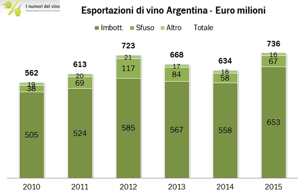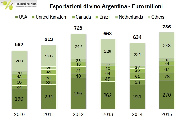 L’Argentina del vino esportato sta vivendo un periodo molto particolare, caratterizzato da una forte svalutazione della moneta alla quale corrisponde un livello di inflazione galoppante. I dati del 2015 che commentiamo oggi sono dunque molto diversi se visti in Euro, +16%, in dollari, -3% o in Peso argentini, +10%. Quello che certamente succederà il prossimo anno è che gli introiti in peso esploderanno per via della ulteriore svalutazione della valuta, circa il 55% la media a oggi contro il livello del 2015. Questo del tasso di inflazione è dunque un aspetto importante: il peso si è svalutato in media del 20% all’anno contro il dollaro e questo chiaramente rende il prodotto argentino molto più competitivo sui mercati internazionali. Fatto il lungo ma dovuto preambolo, immergiamoci ora nei dati, che vedono un 2015 in ripresa del 16% delle esportazioni denominate in euro, a 736 milioni di euro. Ciò pone l’Argentina al decimo posto nella graduatoria mondiale degli esportatori di vino, quando invece ricopre il quinto posto tra i produttori. In effetti, con una produzione media di 14 milioni di ettolitri di vino annui e un export medio di 3 milioni, la quota di prodotto che esce dai confini è di poco superiore al 20%. Questo significa diverse cose: che gli argentini bevono tanto vino (vero, 25 litri pro capite annui) e nello stesso tempo non si possono permettere i vini internazionali vista la svalutazione del peso, ma anche che il potenziale del prodotto argentino magari non si è ancora espresso appieno, soprattutto fuori dal mercato americano. Andiamo ai numeri.
