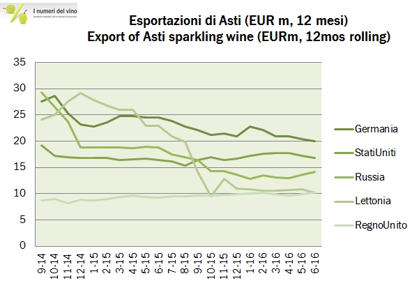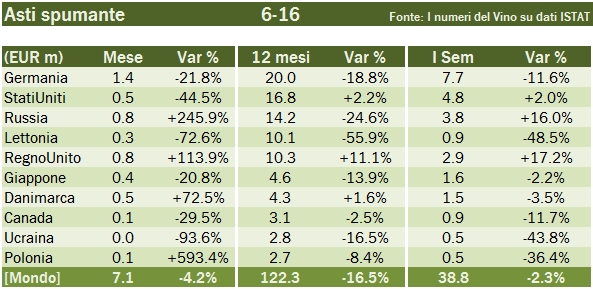 - L’Asti spumante chiude il semestre a 39 milioni di euro, -2%. E’ un periodo poco rilevante per il prodotto (più stagionale del prosecco), ma sembra che il calo si stia attenuando. In ragione d’anno il prodotto è ancora in forte calo, -17%, ma quasi tutto è attribuibile alla seconda metà dello scorso anno. I dati restano negativi nel principale mercato, la Germania, -12% a 8 milioni di euro, mentre sembra riprendersi la Russia, +16% a 4 milioni di euro. Prosegue il crollo della Lettonia, mentre nel Regno Unito le cose sembrano migliorare, +17% a 3milioni di euro.