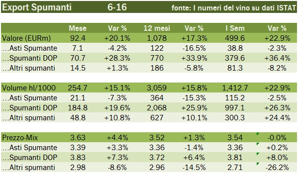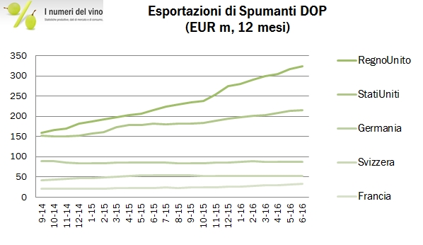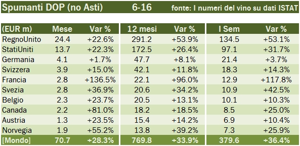 - Gli spumanti DOP crescono del 36% a 380 milioni di euro nel primo semestre e si portano a 770 milioni di euro in ragione d’anno, +34%. Spiace ripetersi tutte le volte, sono guidati dal Regno Unito dove prosegue imperterrito un vero e proprio boom: +53% a 134 milioni nel primo semestre, con +23% anche in giugno. Molto buoni restano i dati sugli USA, che nel caso dei DOP chiudono a 97 milioni di euro, +32%. Unico mercato che non progredisce tra i grandi è la Germania, nel semestre in crescita “solo” del 4% a 21 milioni di euro, mentre merita attenzione il progresso nel difficile mercato francese, dove le esportazioni sono più che raddoppiate a 13 milioni di euro.