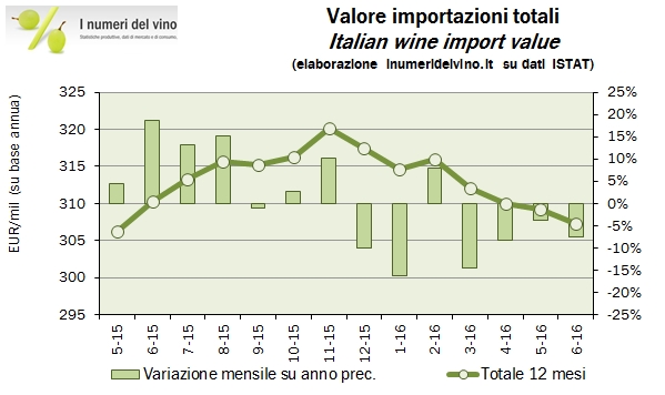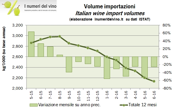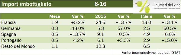 Nei primi 6 mesi 2016 l’Italia ha importato meno vino dello scorso anno. Si tratta per lo più di mancate importazioni di vini sfusi, che a logica dovrebbero fare da specchio alla disponibilità di vino comune nel mercato domestico. Come abbiamo visto qualche giorno fa, per i vini da tavola il 2015 è stata è una ottima annata in termini di volume. Infatti sono proprio i vini da tavola a subire un calo di oltre il 40% dei volumi. Viaggia invece in decisa controtendenza l’importazione di vini spumanti, principalmente Champagne, che crescono di oltre il 30%, seppur nel semestre poco significativo. Tirando le somme, l’Italia ha importato vino per 123 milioni di euro, in calo dell’8%, a fronte di un volume di 860mila ettolitri, il 40% in meno del semestre 2015. Andiamo a leggere insieme i dati.