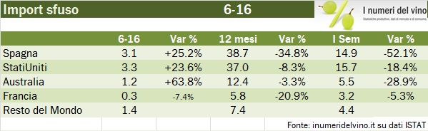 - In termini di volume, le importazioni sono calate del 40% a 0.86 milioni di ettolitri nel semestre, mentre nell’arco dei 12 mesi il totale scende del 27% a 2.1 milioni di ettolitri. Fonte del rallentamento sono i vini sfusi che scendono del 43% a 0.7 milioni di ettolitri nel semestre e del 30% a 1.8 milioni di ettolitri sugli ultimi 12 mesi.