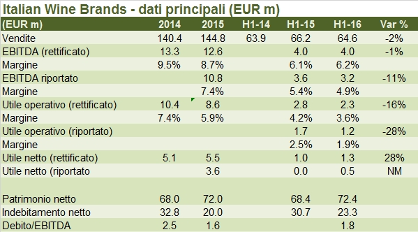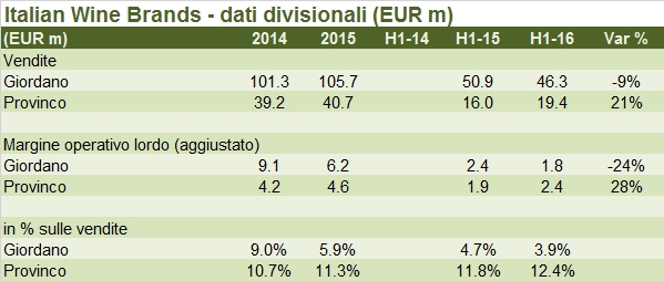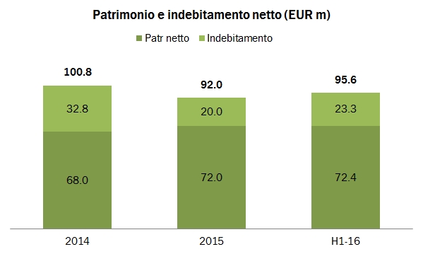 - Dal punto di vista finanziario, il debito cala da 30 a 23 milioni tra semestre 2015 e semestre 2016, mentre risulta in leggera crescita rispetto a fine anno (20 milioni) essenzialmente a causa di fattori stagionali. Il rapporto debito su MOL si attesta a circa 1.8 volte a fine giugno da 1.6 volte di fine anno, ma come abbiamo detto il semestre normalmente mostra un debito più elevato del fine anno per le aziende del settore vinicolo.