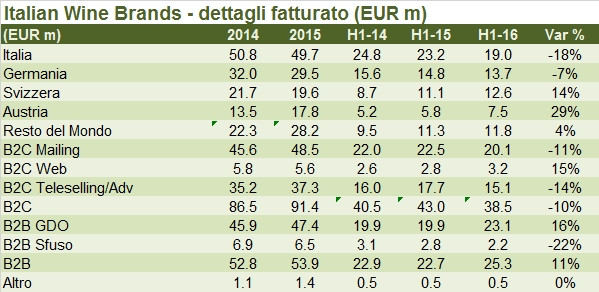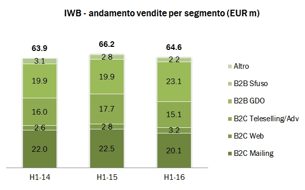 - In una seconda suddivisione troviamo invece un calo delle vendite B2C del 10% a 38 milioni di euro e un incremento di quelle B2B dell’11% a 25 milioni. Se scaviamo all’interno delle due divisioni possiamo notare una caduta dell’11% e del 15% rispettivamente per la divisione di vendite telefoniche e via trasmissioni televisive per il B2C, non compensate dal canale internet, che pur cresce del 15% a 3.2 milioni di euro nel primo semestre 2016. Nella divisione B2B invece l’attività è fortemente concentrata sulla GDO, che segna un incremento del 16%.