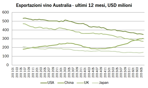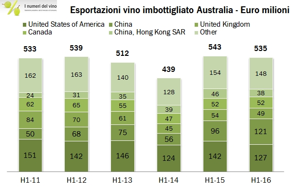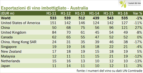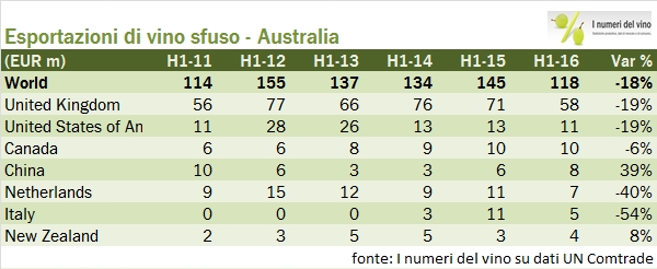 Le esportazioni australiane non hanno ripetuto l’exploit del 2015 nel corso dei primi 6 mesi di quest’anno, sia che le si guardi in Euro che in dollari o nei dollari australiani. I dati pubblicati da UN Comtrade indicano un totale export in calo del 5% a 672 milioni di euro, interamente legato alla caduta delle esportazioni di vino sfuso, che hanno in passato rappresentato un forte supporto al settore australiano del vino. Il prodotto sta perdendo quota in USA e nel Regno Unito da diversi anni e nel primo semestre la crescita in Cina (+27%, con un raddoppio nel corso degli ultimi 2 anni) non è servita a compensare. Come vedremo domenica sera, non e’ pero’ ancora venuto il momento in cui l’Australia lascerà il posto agli USA come quinta potenza mondiale nell’export di vino, visto che gli USA hanno accusato il colpo della rivalutazione del dollaro nei primi mesi del 2016. Andiamo ad analizzare i dati.