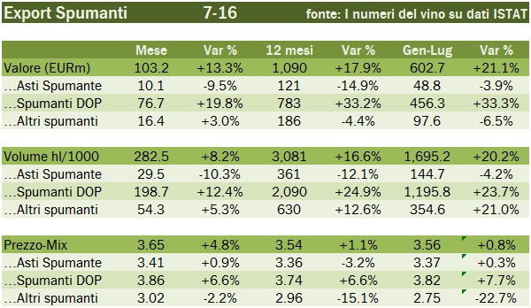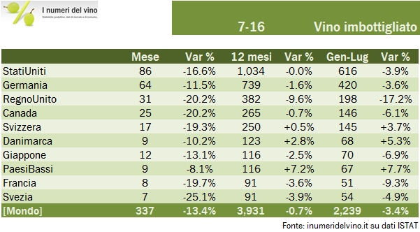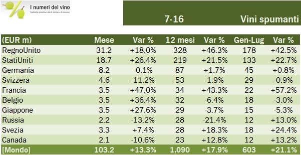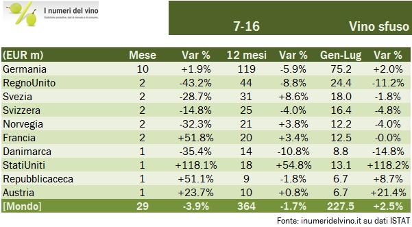 - Nel mese di luglio le esportazioni di vino italiano sono calate dell’8% a 469 milioni di euro. Di queste, 337 milioni sono relativi a vini in bottiglia, -13%, 29 milioni di euro sono vini venduti in formati da oltre 2 litri (che noi chiamiamo sfusi), mentre la rimanente parte sono vini spumanti: EUR103 milioni, ben il 13% in più rispetto al 2015 (luglio), nonostante la forte dipendenza dal Regno Unito.