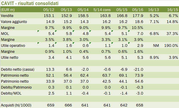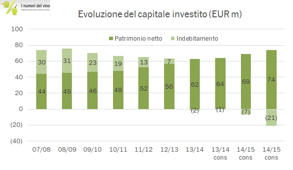 • La parte finanziaria va letta con attenzione. CAVIT dichiara un forte miglioramento della posizione finanziaria netta da 7 a 21 milioni di euro. Il dato “quadra” con una politica di investimenti molto moderata, 1.5 milioni rispetto a 4 milioni di euro ammortizzati. Non “quadra” invece con il forte incremento del capitale circolante da 64 a 74 milioni di euro. La quadratura viene dal rapporto con i soci. I debiti commerciali verso i soci sono passati da 44 a 55 milioni di euro e spiegano da soli ben 11 dei 14 milioni di euro di miglioramento della struttura finanziaria. Una normalizzazione di questa voce potrebbe quindi avere un impatto nel corso del 2016.