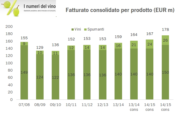 • In termini di vendite per categoria, il fatturato degli spumanti cresce dell’8% a 26 milioni (di questi come dicevamo 7 sono generati dalla controllata tedesca), mentre nei vini fermi le vendite toccano quota 150 milioni, +7%.