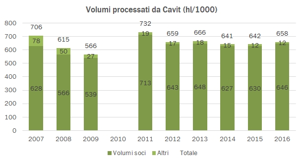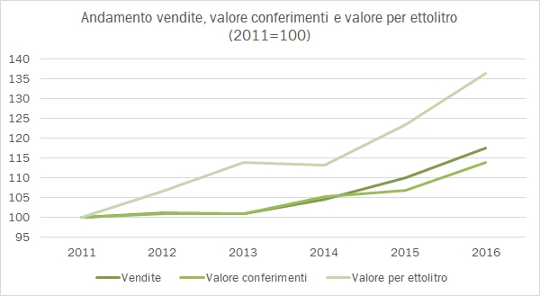 • L’”economia” della cooperativa va però guardata dal lato conferimenti. I dati di Cavit sono piuttosto incompleti, ma trovate un grafico con i volumi, che nel 2016 sono cresciute da 642mila a 658mila ettolitri (+2.5%), quasi completamente da parte dei soci. Non abbiamo il dato sul valore medio dei conferimenti, salvo che questo valore è cresciuto nel 2016 del 10% rispetto all’anno scorso. Se ripercorriamo questo dato per gli ultimi 5 anni arriviamo a una crescita cumulata dal valore per ettolitro del 37%, pari al 6.4% annuo. Se passiamo dal valore per ettolitro al “fatturato” che i conferenti hanno realizzato i dati sono meno positivi, segnando un incremento netto di circa il 2.6% annuo.