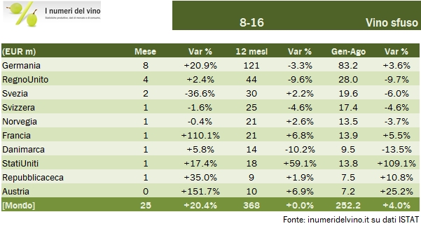 • Per i vini agosto è stato buono ma le esportazioni da inizio anno restano negative, -2% a 2.5 miliardi. I volumi calano del 5% circa sui primi 8 mesi, con i primi 4 mercati (USA, Germania, Regno Unito e Canada) tutti con il segno meno davanti. Tra i primi 10 mercati soltanto l’Olanda sembra registrare una crescita sostanziosa nel 2016.