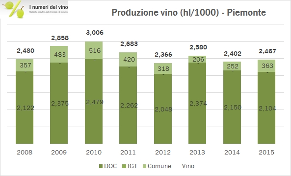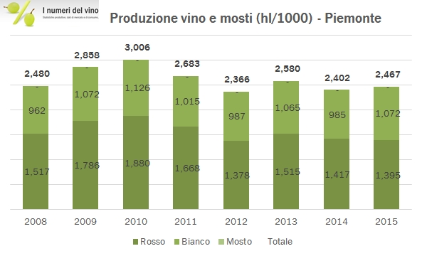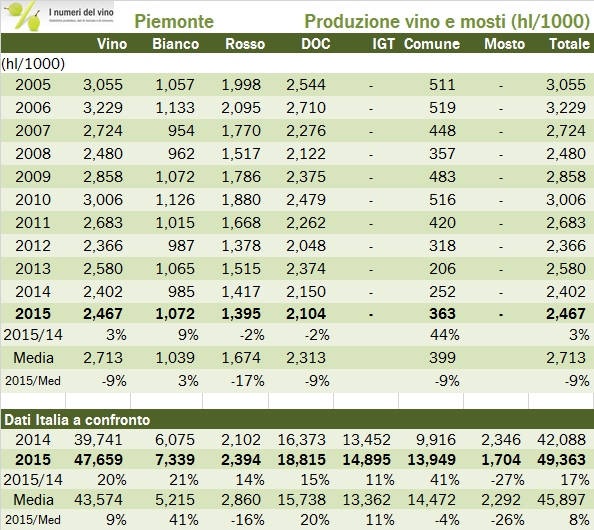 La produzione vinicola 2015 in Piemonte non è cresciuta nel 2015, come nella maggior parte delle altre regioni. Di converso, le previsioni per il 2016 sono per un moderato incremento (+5%), nel contesto di una produzione nazionale probabilmente in lieve calo. Le tabelle e grafici che seguono mostrano come la regione Piemonte abbia una superficie vitata strutturalmente in calo (al contrario di quanto abbiamo visto in Veneto), circa il 12% in meno nel 2015 rispetto al censimento 2010 e una produzione di vino che anche in una annata positiva come il 2015 si è attestata intorno a 2.4-2.5 milioni di ettolitri, quindi il 9% circa sotto la media decennale… e paradossalmente il calo più importante lo si riscontra nella produzione dei vini rossi. Andiamo a leggere insieme qualche dato.