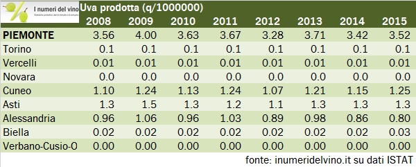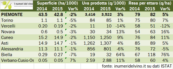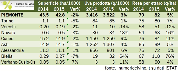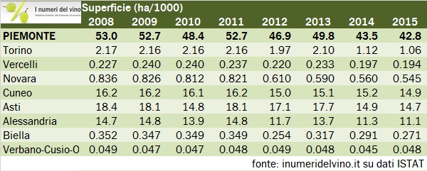 - L’analisi forse più interessante riguarda le superfici vitate, che ho re-introdotto quest’anno. I dati hanno qualche problemino (vedere annata 2013, che forse andrebbe “cancellata”, forse farò così per le prossime regioni). Secondo questi dati il Piemonte ha perso circa il 12% della superficie vitata tra il 2010 e il 2015, circa 5600 ettari, portandosi a 42800 ettari. Questo spiegherebbe la produzione più bassa della media storica nonostante la buona annata. Dal punto di vista provinciale, come potete apprezzare, si direbbe che ben 1000 di questi ettari si siano persi in provincia di Torino (il 50%), che mi sembra un po’ inverosimile, come anche il 20-30% di meno a Novara e Vercelli. Detto questo, la tendenza calante sembra essere evidente anche a Cuneo, -7% in 5 anni, la provincia certamente più vocata della regione.