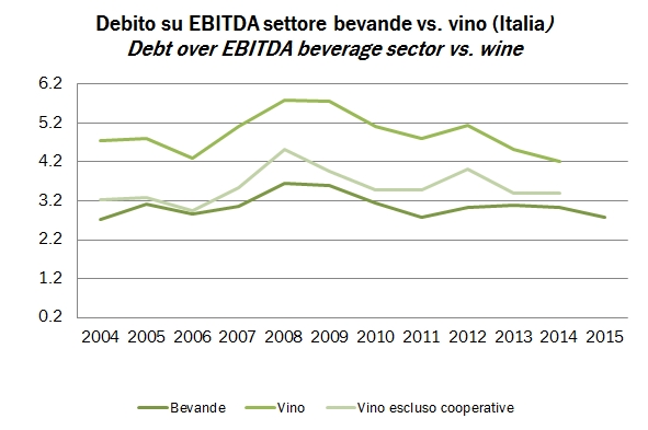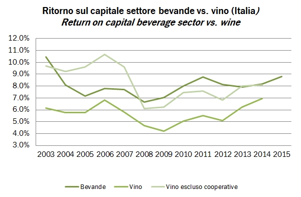 - Il ritorno sul capitale ha raggiunto il 9% nel 2015, dall’8.2% del 2014. Il settore del vino nel 2014 era all’8.1% escludendo le cooperative e ulteriori progressi sono stati messi a segno nel 2015. Possiamo dunque dire che non ci sono significative differenze.