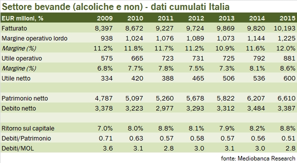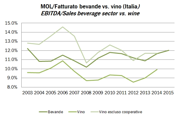 - Per quanto riguarda i margini reddituali il discorso non cambia. Il settore bevande era all’11.6% nel 2014 ed è salito al 12% nel 2015. Il settore del vino ex cooperative era all’11.7% nel 2014, che diventa 10% se consideriamo anche la parte della cooperazione.