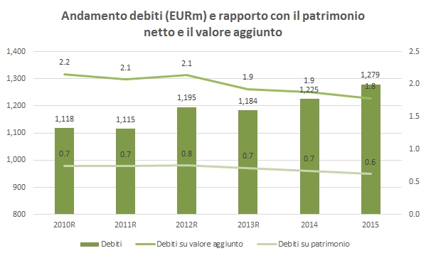 - Il quadro generale è dunque di un settore che si è rafforzato finanziariamente, con un rapporto tra debito e patrimonio passato da 0.67 nel 2014 a 0.63 e ben al di sotto del livello di 0.75 di cinque anni fa. Anche il confronto tra debito e valore aggiunto (non abbiamo purtroppo qui il margine operativo lordo, più adatto al calcolo) si muove al ribasso, passando da 1.9 a 1.8 volte, rispetto a 2.1 volte del 2010.