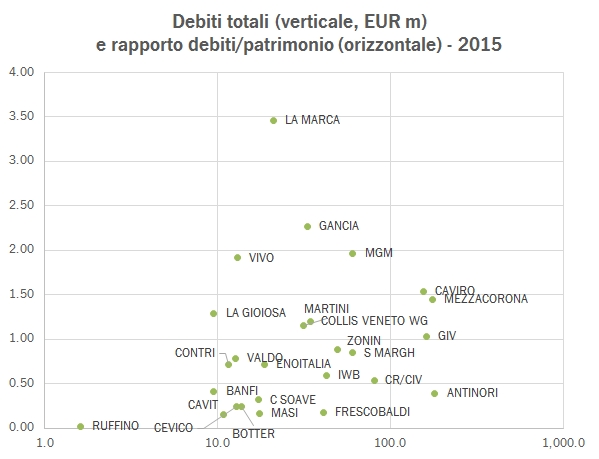 - Quando muoviamo dai valori assoluti ai rapporti le classifiche si riequilibrano e ci ritroviamo con un’analisi più obiettiva. Nella matrice è decisamente più importante la dimensione verticale (rapporto debito su patrimonio) che quella orizzontale (debito). Ad ogni modo, Gancia e La Marca sono certamente le aziende più indebitate in rapporto agli indicatori di patrimonio e valore aggiunto, insieme a MGM. Dall’altra parte hanno completamente cancellato il debito aziende come Ruffino, Masi (in seguito alla quotazione in Borsa) e anche Cavit ha un livello di debito particolarmente contenuto sia rispetto al patrimonio che al valore aggiunto.