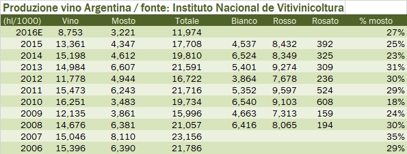 - Nel 2016 è previsto quindi un tracollo della produzione, con una riduzione del 35% a 8.8 milioni di ettolitri di vino e del 25% dei mosti (3.2milioni). Come anticipavamo sopra, per Mendoza siamo a -41% per una produzione di poco superiore a 6 milioni di ettolitri.