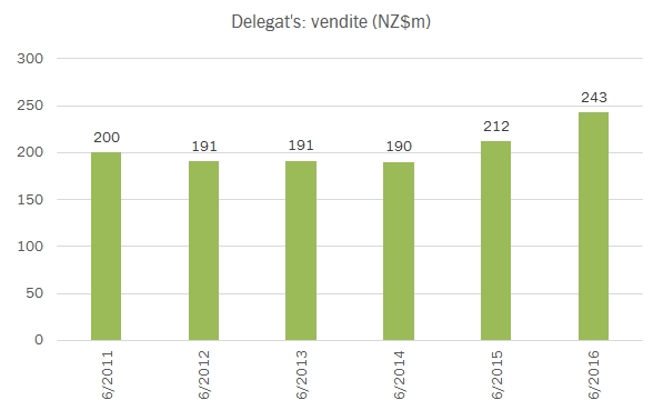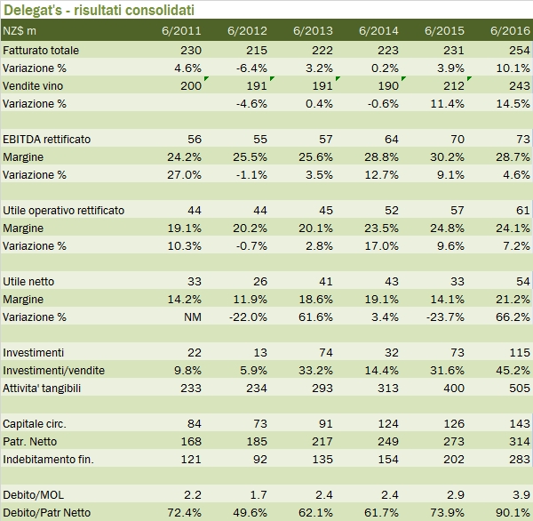Mondi lontani quelli della Nuova Zelanda, però sono contento di aver investito tempo nell’analisi di Delegat’s Group perché ci troviamo oggi di fronte a un’azienda vinicola da 160 milioni di euro di fatturato (243m di dollari locali), con un margine operativo del 24% e che continua a investire pesantemente in vigneti e impianti (la bellezza di 76 milioni di euro, quasi la metà del fatturato, nel 2016), per finanziare una crescita attesa di volumi del 40-45% nel corso dei prossimi 5 anni, principalmente da realizzare in USA e Canada.