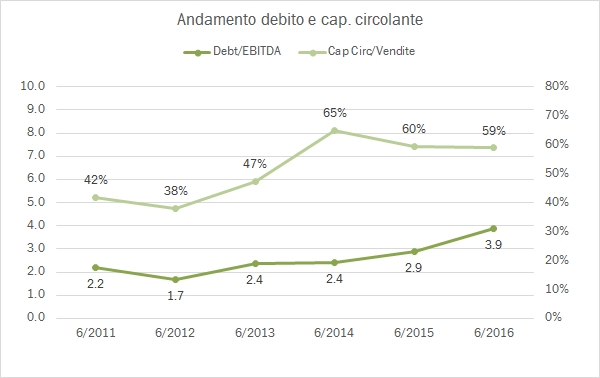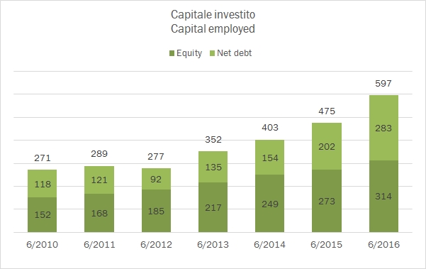 - La parte finanziaria vede un appesantimento del debito, che cresce da 202 a 283 milioni di dollari, a fronte però di un colossale piano di investimenti, 115 milioni di dollari nel 2016 contro i già tanti 73 del 2015. Delegat’s ha investito nel 2015 e 2016 tanto quanto nei 7 anni precedenti messi insieme. Il rapporto debito su EBITDA cresce da 2.9 a 3.9x, un livello che comincia a essere piuttosto elevato, anche se ben supportato dal valore delle attività tangibili (che rappresentano la maggior parte dell’investimento). Il capitale investito balza dunque a 600 milioni di dollari, il che implica un ritorno sul capitale dell’11.5%, contro un livello del 14-15% degli ultimi anni.