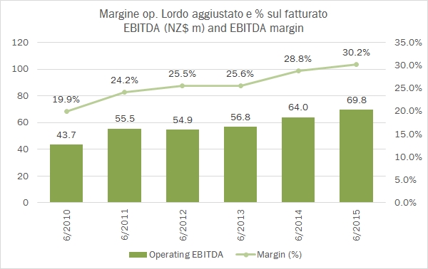 Ma torniamo a guardare i numeri del 2016, considerando che ci focalizziamo sui risultati aggiustati per le variazioni del valore dei vigneti, che vengono contabilizzati ma che distorcono i dati di anno in anno. Il cambio attuale euro contro dollaro neozelandese è 1.51, il che significa che potete tradurre tutti i dati in euro dividendo per questo valore.