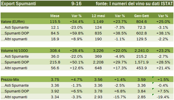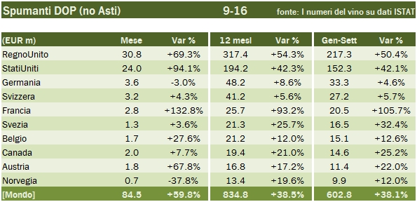 Esportazioni di spumante / Italia – aggiornamento settembre 2016