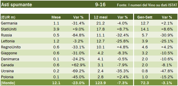 • Dall’altro lato, Asti spumante. Da inizio anno l’andamento è negativo del 3% a 72 milioni di euro, sui 12 mesi ancora -7% a 124 milioni. Volumi in calo del 5% su base annua (-3% nei 9 mesi), prezzo medio di esportazione fermo a 3.36 euro nei 9 mesi e sui 12 mesi.