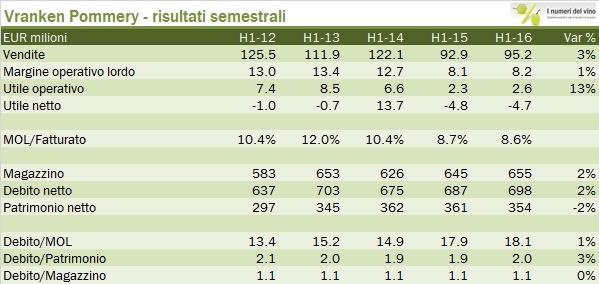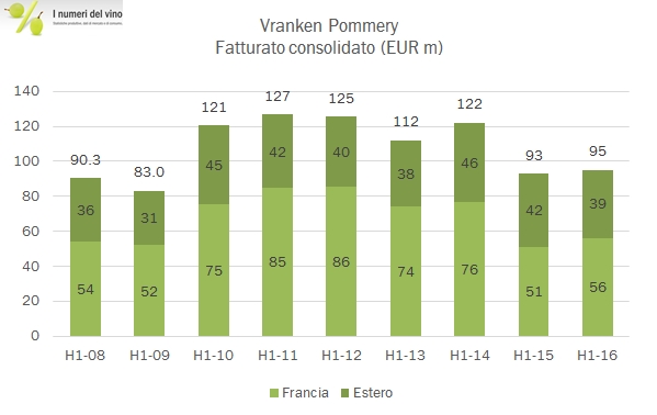 - Il fatturato di 95 milioni cresce del 2.5% nel primo semestre, con un incremento del 10% in Francia a 56 milioni di euro. L’andamento in Europa è stato invece molto negativo, con un calo delle vendite da 31 a 28 milioni di euro, mentre il resto del mondo mostra una leggerissima crescita (11 milioni). Curiosamente, Vranken dichiara che “un solo cliente rappresenta più del 15% delle vendite nei primi sei mesi”…