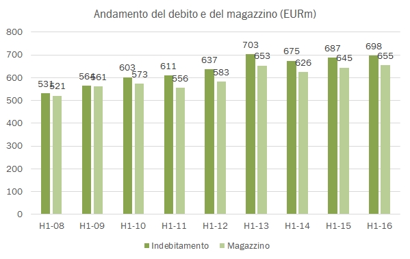 - La parte finanziaria vede il debito crescere di 11 milioni da giugno 2015 a giugno 2016, quasi 700 milioni di euro e un rapporto di 18 volte l’EBITDA. Anche volendo togliere (come è giusto) il valore di Listel, arriviamo a 17 volte. Il rapporto debito/magazzino resta stabile a 1.07 volte. Nel periodo l’azienda ha distribuito 7 milioni di dividendi, in calo rispetto ai 9 dell’anno precedente.