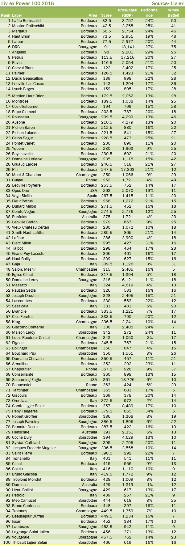 - Come dicevamo i vini francesi dominano. Il primo vini di Borgogna resta DRC, 18141 sterline per cassa, ben 75 referenze trattate, +27%. Si classifica al sesto posto, unico non Bordeaux dei primi 10. Champagne: trentesimo Moet & Chandon, 1066 sterline per cassa, +9%, 29 referenze trattate. Rodano: primo in classifica Guigal, 31esimo, 1721 sterline per cassa, +4%, 49 referenze trattate.