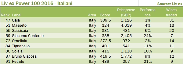 - Passando ai vini italiani, il primo in classifica è il numero 47, Gaja, con un prezzo per cassa di 1126 sterline, una crescita del 3% delle quotazioni e 31 vini trattati. Masseto viene al 51esimo posto, 4619 euro per cassa, +4% e 13 referenze trattate. Terzo, in forte calo rispetto agli scorsi anni, Sassicaia, 55esimo con 481 sterline per cassa, +6% e 20 referenze trattate. Da questi numeri potete già valutare come il prezzo dei vini italiani sia cresciuto meno della media (10% contro 14%). A “battere” la media, Giacomo Conterno, +24%, 2400 sterline per cassa (ma solo 7 referenze trattate) e al 91esimo posto Petrolo, +21% con 257 sterline per cassa.