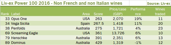 - Fuori dalla Francia e dall’Italia, due vini americani, Opus One (33esimo) e Screeaming Eagle (69esimo), uno spagnolo Vega Sicilia (34esimo) e tre australiani: Penfolds (38esimo), Henschke (79) e Dominus (89)