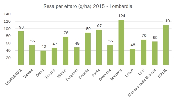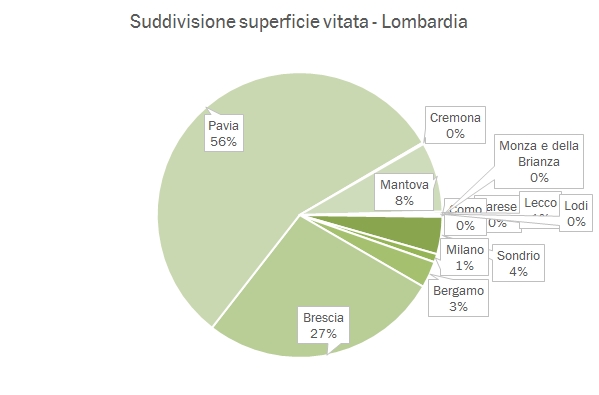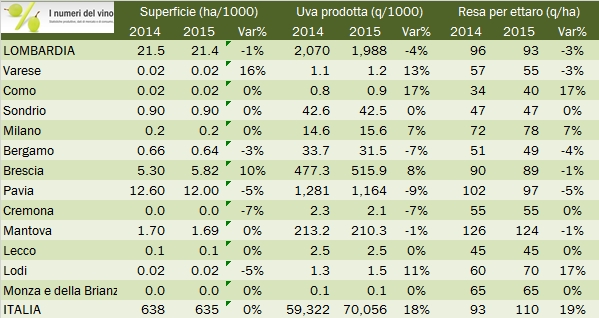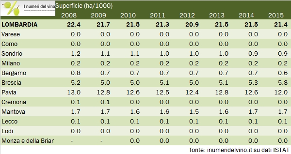 - I dati forse più interessanti, oltre al grafico di dettaglio della produzione regionale per tipologia (torta) sono quelli relativi alle produzioni e superfici provinciali. Secondo ISTAT nel 2015 la superficie vitata lombarda è rimasta pressochè stabile a 21400 ettari. All’interno di questo dato si cela un netto calo in provincia di Pavia (Oltrepo’), da 12600 a 12mila ettari, e un incremento quasi corrispondete, da 5300 a 5800 ettari in provincia di Brescia (Franciacorta principalmente). Le produzioni di uva si muovono quindi in modo corrispondente: +8% a Brescia e -9% a Pavia, con una resa per ettaro rispettivamente di 89 e 97 quintali per ettaro. Vi lascio ai numerosi contributi grafici.